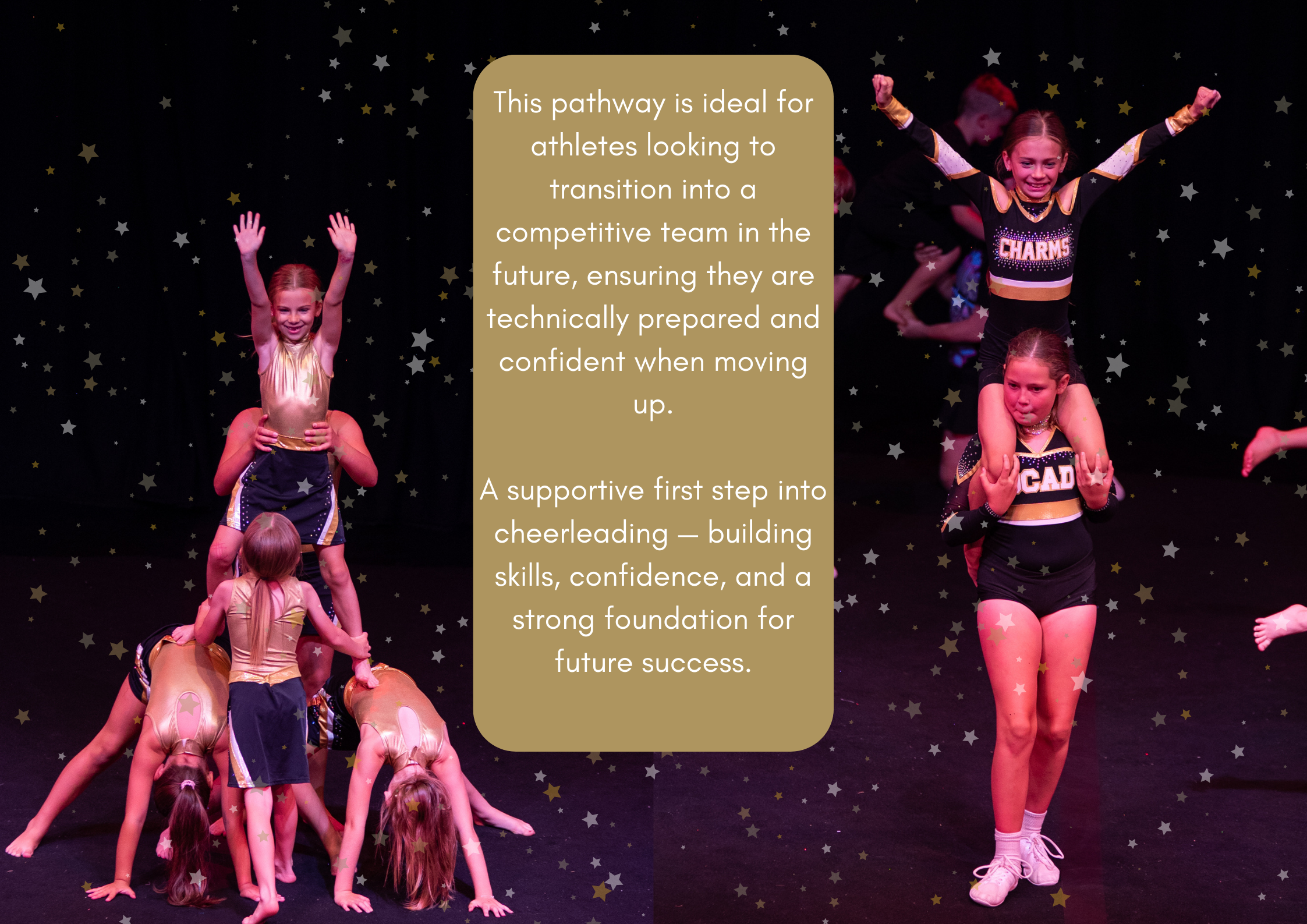 Perfect for beginners or athletes new to Cheerleading, our development programme helps athletes gain confidence, improve strength and coordination, and understand the fundamentals of teamwork and performance. The structured progression allows athletes to learn at their own pace while preparing them for the expectations of competitive cheer